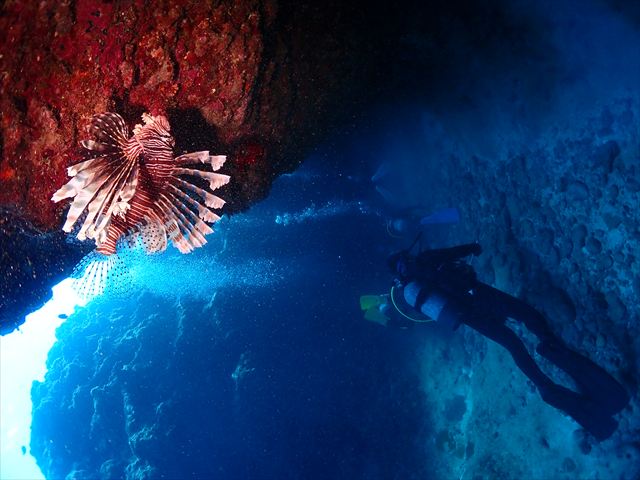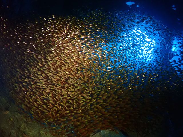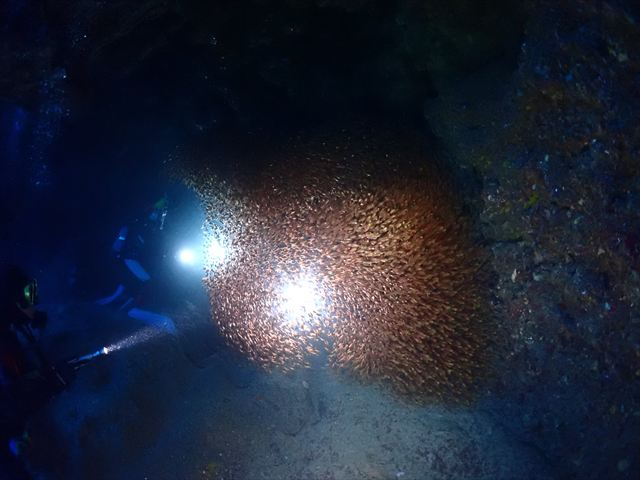 | メモ | ゲストリクエスト、今が旬の「ミニのキンメ」! 今日もかなりの数がトンネル入り口付近で渦を巻いてます。このキンメの群れを最初に確認したのは9月10日、もうけっこう長く居てくれてますね♪ 帰りにはツムブリの群れ、船の下ではアオウミガメに出会えました。 |