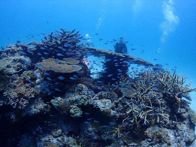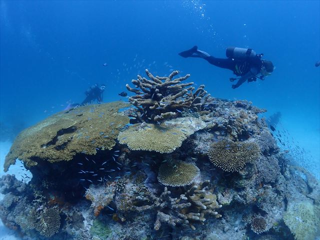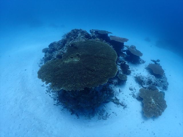 | メモ | ランチ休憩後はそのまま砂地ポイントへ。 伊良部島・下地島ではこんな大きなテーブルサンゴはなかなか見られないのでたまにはいいね。 ノコギリダイやヨスジフエダイの子供、スカシテンジクダイなどの小魚たちがたくさん群れてる姿をのんびりと観察できました。 |