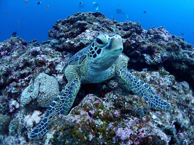 | メモ | 2本目は宮古を代表する地形ポイントへ。この時期ポイント貸し切りで自由に周れるのが良いですね。 船の近くには綺麗好きなチビッ子アオウミガメが1匹。エントリーからエキジットまでずーーっと甲羅を岩にスリスリしてせっせと掃除してました。よく見るとこの子の甲羅はピカピカ☆ その様子がとても可愛い♡ |