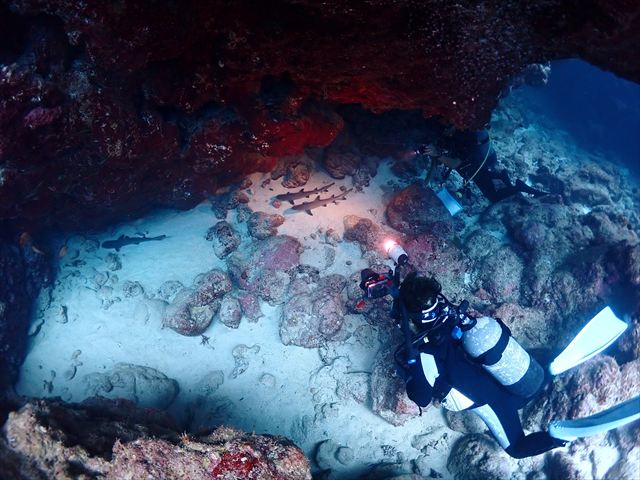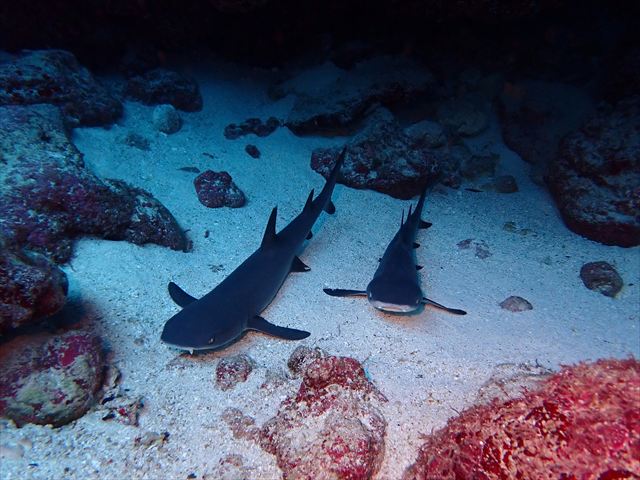 | メモ | ゲストと相談の結果、3本目はまったり癒しのダイビングを。流れなし・水深浅めのポイントでゆっくり地形と生物を楽しみます。 ホワイトチップ3兄弟は今日も仲良くお昼寝中♡ 一応サメですけどこのサイズなら全然怖くない。オオメカマス(15匹)もいい感じで我々の周りを回ってくれてました。 |