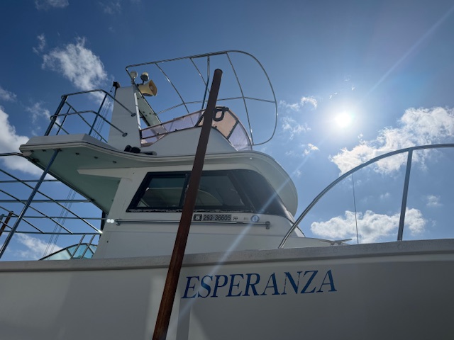 まずは船体のサビ落としです。海水中に含まれる鉄分が船体に付着して全体的にだんだん黄ばんでくるので年に一度薬品を使って落とします。作業前後で白さが全然違うのでやりがいがある仕事。2時間ほどでピカピカ☆に蘇りました! ついでに後部ステップとアンカーローラーのサビ落としや海水こし器の掃除・防食亜鉛の交換も。