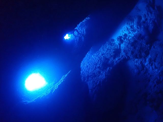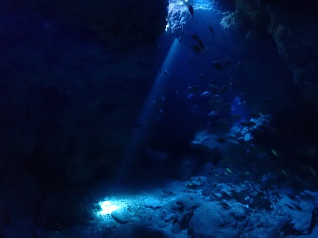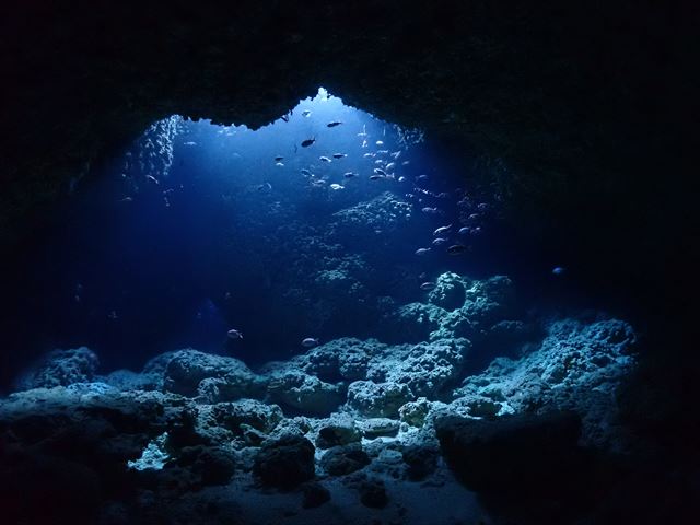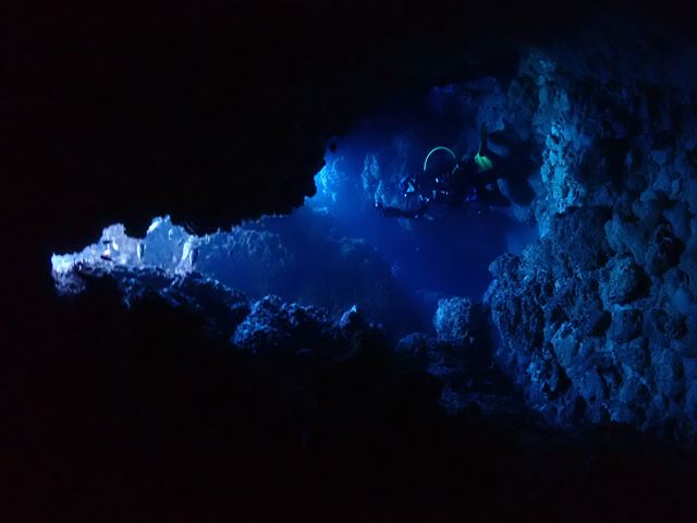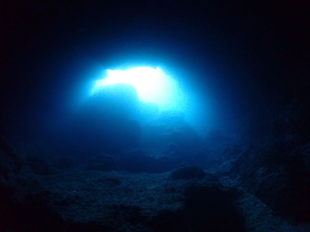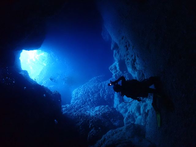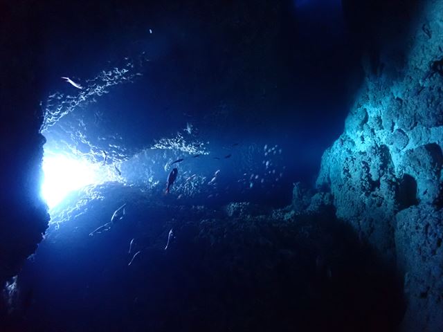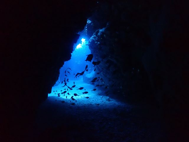 | メモ | 連休の混雑は昨日までで終わったのか穴は貸切でゆっくり周れました。ところどころ差し込む光を眺めたり、わざとライトを消して真っ暗な中から外のブルーを楽しんだり。 ここも透明度良し☆ 安全減圧中に中層を漂ってたヨコシマクロダイの群れ。明るい太陽光を浴びながらボーっと浮かんでる感じが平和的でいいですね。彼らを見てるとなんだか癒されます…。 |